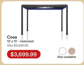 The Cosa 10x13 Motorized is currently available at a discount at Club Piscine. On this page, you will find all the details about the current price, the promotion terms, and the validity period. You can also explore comparable deals and promotions for Cosa 10x13 Motorized to make the most cost-effective choice.