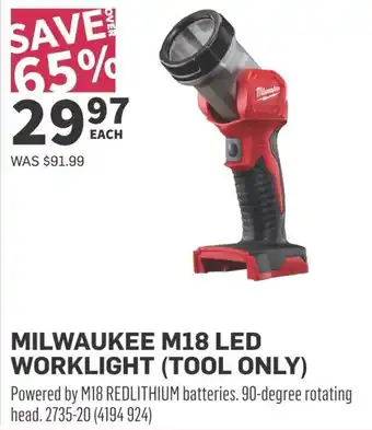 This promotion is available in various stores, view all products to get the cheapest Milwaukee m18 led worklight. If you'd like to find out whether this product has a bigger discount in another store, check the category 'Grocery'. You may also find these offers interesting: MotoMaster 3-Sided LED Worklight, Ultra performance led tripod worklight & Milwaukee m18 fuel reciprocating saw.