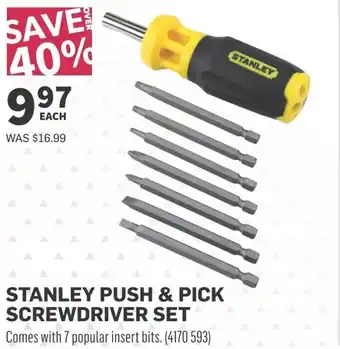 This promotion is available in various stores, view all products to get the cheapest Stanley push & pick screwdriver set. If you'd like to find out whether this product has a bigger discount in another store, check the category 'Grocery'. You may also find these offers interesting: 50 Pc. Screwdriver Set, 4 pc Precision Pick Set & 7-in-1 Multi-Bit Screwdriver Set, Set of 2.