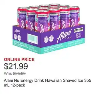 Now on sale at Costco: Alani Nu Energy Drink Hawaiian Shaved Ice 355 mL 12-pack ✅ Valid from 22-12 to 28-12.
