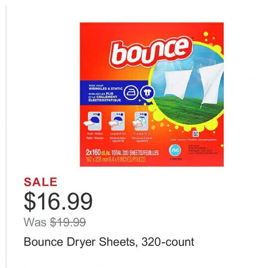 | Bounce dryer sheets, 320-count | Costco | $16.99 | 27 December 2022 | 02 January 2023 | |||