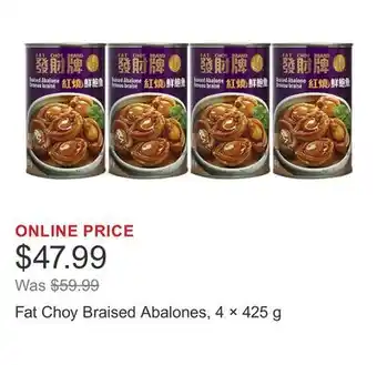 The price of Fat Choy Braised Abalones, 4 × can be found at the top of the page, together with the dates during which the offer is available. You can also check the price in the current Costco flyer or on the Costco website. Promotional offers assure you of buying Costco products at the lowest price.