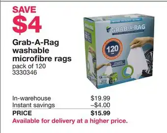 This promotion is available in various stores, view all products to get the cheapest Grab-A-Rag washable microfibre rags. If you'd like to find out whether this product has a bigger discount in another store, check the category 'Grocery'. You may also find these offers interesting: Grab-A-Rag Washable Microfibre Rags, 120-count, 10 lb Shop Rags & Grab bar, 16.