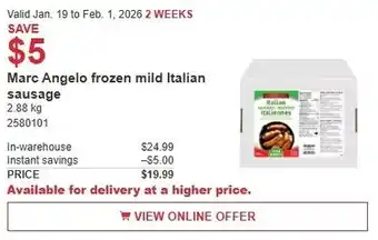 Marc Angelo frozen mild Italian sausage offer at Costco