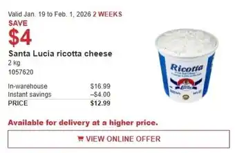 The Santa Lucia ricotta cheese is available this week at Costco with a valuable discount. On this page, you will find details about the current promotional price, the promotion terms, and any special discounts. You can also explore other related deals and promotions for Santa Lucia ricotta cheese to make sure you get the best value.