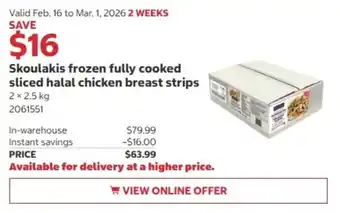 The discount for Skoulakis frozen fully cooked sliced halal chicken breast strips runs from 16-02-2026 to 01-03-2026. If this promotion has ended, other similar offers are still available to view. Following the product category ensures you stay updated as soon as Skoulakis frozen fully cooked sliced halal chicken breast strips is on sale again at Costco. Comparing Skoulakis frozen fully cooked sliced halal chicken breast strips deals helps you purchase at the most competitive price. Check our site regularly to see if Skoulakis frozen fully cooked sliced halal chicken breast strips returns soon with a new discount.