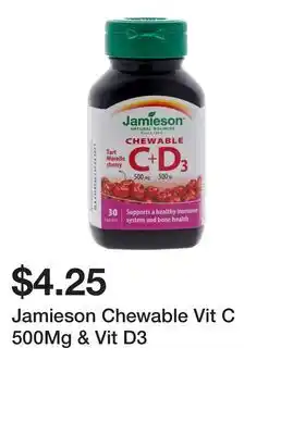 This promotion is available in various stores, view all products to get the cheapest Jamieson Chewable Vit C 500Mg & Vit D3. If you'd like to find out whether this product has a bigger discount in another store, check the category 'Grocery'. You may also find these offers interesting: Jamieson vitamin C or D, Jamieson vitamin C & IMODIUM Anti-Diarrheal Liqui-Gels (12) or VIT-DISSOUS Tablets (10).