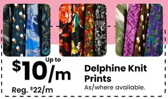 The Delphine Knit Prints is available this week at Fabricland with a valuable discount. On this page, you will find details about the current promotional price, the promotion terms, and any special discounts. You can also explore other related deals and promotions for Delphine Knit Prints to make sure you get the best value.