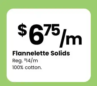 The price of Flannelette Solids can be found at the top of the page, together with the dates during which the offer is available. You can also check the price in the current Fabricland flyer or on the Fabricland website. Promotional offers assure you of buying Fabricland products at the lowest price.