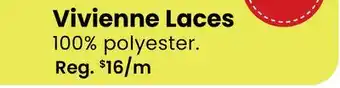 The price of Vivienne Laces can be found at the top of the page, together with the dates during which the offer is available. You can also check the price in the current Fabricland flyer or on the Fabricland website. Promotional offers assure you of buying Fabricland products at the lowest price.