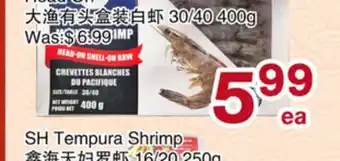 This promotion is available in various stores, view all products to get the cheapest SH Tempura Shrimp. If you'd like to find out whether this product has a bigger discount in another store, check the category 'Grocery'. You may also find these offers interesting: Tempura shrimp, SH White Shrimp Headless & Aqua Star Garlic & Herb shrimp or tempura shrimp.