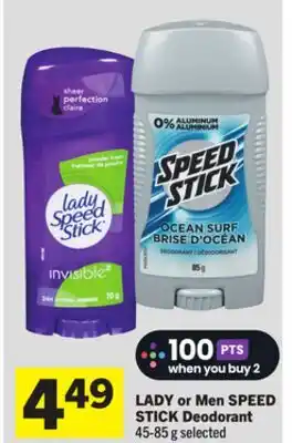 This promotion is available in various stores, view all products to get the cheapest LADY or Men SPEED STICK Deodorant. If you'd like to find out whether this product has a bigger discount in another store, check the category 'Grocery'. You may also find these offers interesting: LADY or MEN SPEED STICK, GARNIER OR SPEED STICK OR LADY SPEED STICK Produits sélectionnés & Softsoap liquid hand soap, speed stick or lady speed stick.
