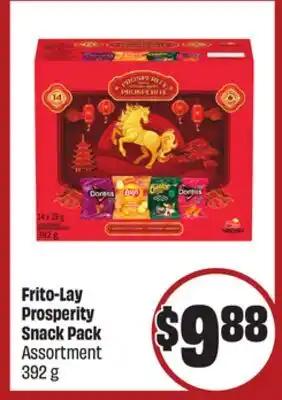 This promotion is available in various stores, view all products to get the cheapest Frito-Lay Prosperity Snack Pack Assortment 392 g - LNY. If you'd like to find out whether this product has a bigger discount in another store, check the category 'Grocery'. You may also find these offers interesting: FRITO LAY Prosperity Pack Snacks, FRITO-LAY Prosperity Pack Snacks & FRITO-LAY VARIETY PACK CHIPS, 428/448 g.