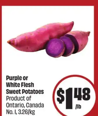 FreshCo offers a wide collection of products, besides the Purple or White Flesh Sweet Potatoes - LNY. Keep an eye on the weekly FreshCo flyer to find the best offers and promotions. Besides Purple or White Flesh Sweet Potatoes - LNY, you can also find the following offers: Purple or White Flesh Sweet Potato Product of Ontario Canada No. 1, Purple or White Flesh Sweet Potato Product of Ontario Canada No. 1, 3.26/kg & SWEET POTATOES.