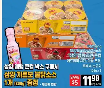 This promotion is available in various stores, view all products to get the cheapest Samyang Mep-Big Bowl 3 kinds. If you'd like to find out whether this product has a bigger discount in another store, check the category 'Grocery'. You may also find these offers interesting: SUPREME ABALONE BIG BOWL FEAST, Korean Shingo Pears 2 Kinds & SAMYANG BULDAK NOODLES.