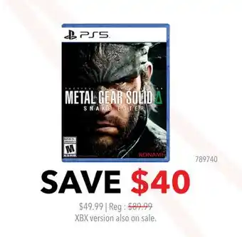 This METAL GEAR SOLID is now on sale at GameStop. Check the current selection filled with great deals and discounts. Purchase METAL GEAR SOLID online via GameStop website or get it at the best available price in person. Flyerdeals.ca gathers the best METAL GEAR SOLID promotions for you. Click on the bell icon to receive a free notification when this product is on sale again.METAL GEAR SOLID promotions for next week