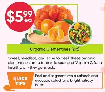 The price of Organic Clementines can be found at the top of the page, together with the dates during which the offer is available. You can also check the price in the current Healthy Planet flyer or on the Healthy Planet website. Promotional offers assure you of buying Healthy Planet products at the lowest price.