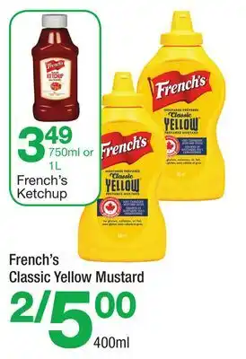 This promotion is available in various stores, view all products to get the cheapest French's Ketchup, French's Classic Yellow Mustard. If you'd like to find out whether this product has a bigger discount in another store, check the category 'Grocery'. You may also find these offers interesting: French's ketchup, FRENCH'S MARINADE, SAUCE OR SEASONING MIX & Longo's Essentials Yellow Mustard.