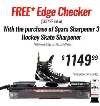 The price of FREE EDGE CHECKER WITH PURCHASE OF SPARX SHARPENER 3 HOCKEY SKATE SHARPENER can be found at the top of the page, together with the dates during which the offer is available. You can also check the price in the current Hockey Life flyer or on the Hockey Life website. Promotional offers assure you of buying Hockey Life products at the lowest price.