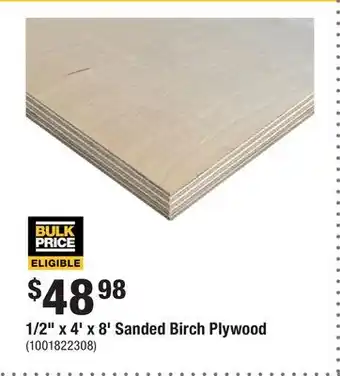 The price of 1/2 x 4' x 8' Sanded Birch Plywood can be found at the top of the page, together with the dates during which the offer is available. You can also check the price in the current Home Depot flyer or on the Home Depot website. Promotional offers assure you of buying Home Depot products at the lowest price.