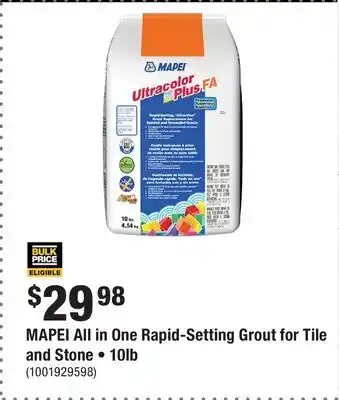 The price of MAPEI All in One Rapid-Setting Grout for Tile and Stone • 10lb can be found at the top of the page, together with the dates during which the offer is available. You can also check the price in the current Home Depot flyer or on the Home Depot website. Promotional offers assure you of buying Home Depot products at the lowest price.