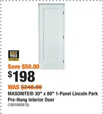 The price of MASONITE 30 x 80 1-Panel Lincoln Park Pre-Hung Interior Door can be found at the top of the page, together with the dates during which the offer is available. You can also check the price in the current Home Depot flyer or on the Home Depot website. Promotional offers assure you of buying Home Depot products at the lowest price.