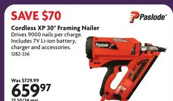 The price of Cordless XP 30° Framing Nailer can be found at the top of the page, together with the dates during which the offer is available. You can also check the price in the current Home Hardware flyer or on the Home Hardware website. Promotional offers assure you of buying Home Hardware products at the lowest price.