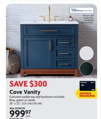 This Cove Vanity is now on sale at Home Hardware. Check the current selection filled with great deals and discounts. Purchase Cove Vanity online via Home Hardware website or get it at the best available price in person. Flyerdeals.ca gathers the best Cove Vanity promotions for you. Click on the bell icon to receive a free notification when this product is on sale again.Cove Vanity promotions for next week