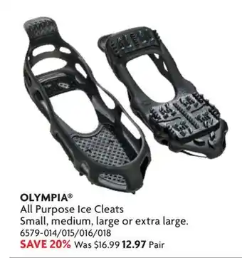 The price of OLYMPIA All Purpose Ice Cleats Small, medium, large or extra large can be found at the top of the page, together with the dates during which the offer is available. You can also check the price in the current Home Hardware flyer or on the Home Hardware website. Promotional offers assure you of buying Home Hardware products at the lowest price.