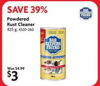 The Powdered Rust Cleaner is currently available at a discount at Home Hardware. On this page, you will find all the details about the current price, the promotion terms, and the validity period. You can also explore comparable deals and promotions for Powdered Rust Cleaner to make the most cost-effective choice.