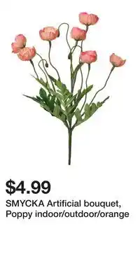 This SMYCKA Artificial bouquet, Poppy indoor/outdoor/orange is currently on sale at IKEA. All details regarding the current price, offer conditions, and validity period can be found on this page. You can also explore other similar deals and promotions related to SMYCKA Artificial bouquet, Poppy indoor/outdoor/orange to make the most cost-effective choice.