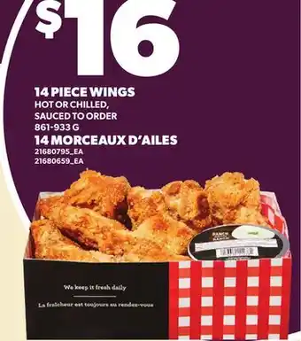 This promotion is available in various stores, view all products to get the cheapest 14 PIECE WINGS. If you'd like to find out whether this product has a bigger discount in another store, check the category 'Grocery'. You may also find these offers interesting: 30 PIECE WINGS & WEDGES BUCKET, 30 PIECE WINGS & WEDGES BUCKET & 30 PIECE WINGS & WEDGES BUCKET, 12 kG.kG.