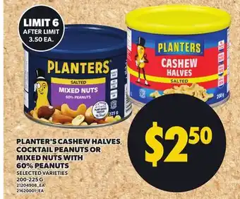 PLANTER'S CASHEW HALVES, COCKTAIL PEANUTS OR MIXED NUTS WITH 60% PEANUTS, 200-225 G promotion at Independent City Market