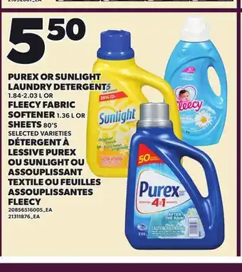 PUREX OR SUNLIGHT LAUNDRY DETERGENT, 1.84-2/.03 L, FLEECY FABRIC SOFTENER, 1.36 l or SHEETS, 80's
