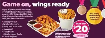 This promotion is available in various stores, view all products to get the cheapest 30 PIECE WINGS & WEDGES BUCKET. If you'd like to find out whether this product has a bigger discount in another store, check the category 'Grocery'. You may also find these offers interesting: 30 PIECE WINGS & WEDGES BUCKET, 30 PIECE WINGS & WEDGES BUCKET & 14 PIECE WINGS.