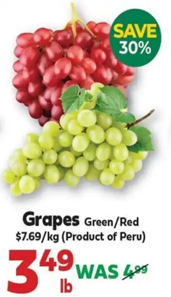 This promotion is available in various stores, view all products to get the cheapest Grapes Green Red. If you'd like to find out whether this product has a bigger discount in another store, check the category 'Grocery'. You may also find these offers interesting: RED OR GREEN SEEDLESS GRAPES, Green or red seedless grapes & green, red or black seedless grapes.