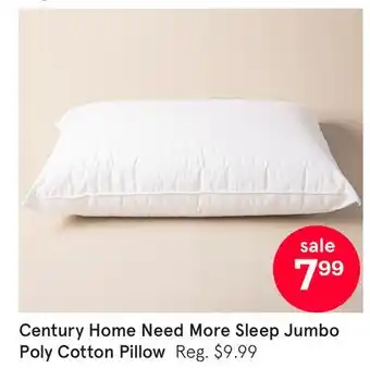 This promotion is available in various stores, view all products to get the cheapest Century Home Need More Sleep Jumbo Poly Cotton Pillow. If you'd like to find out whether this product has a bigger discount in another store, check the category 'Kitchen and Bathroom'. You may also find these offers interesting: Century Home Jumbo Pillow, 2 Pc. Century Home Natural Home Bamboo Pillow Set & Century Pillow.