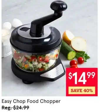 The Easy Chop Food Chopper is available this week at Kitchen Stuff Plus with a valuable discount. On this page, you will find details about the current promotional price, the promotion terms, and any special discounts. You can also explore other related deals and promotions for Easy Chop Food Chopper to make sure you get the best value.