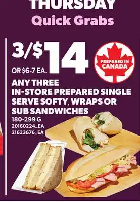ANY THREE IN-STORE PREPARED SINGLE SERVE SOFTY WRAPS OR SUB SANDWICHES offer at Loblaws