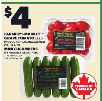 FARMER'S MARKET GRAPE TOMATO, 283 G PRODUCT OF CANADA, MEXICO OR U.S.A. OR MINI CUCUMBERS, 6'S offer at Loblaws