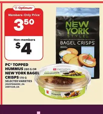 PC TOPPED HUMMUS, 280 G OR NEW YORK BAGEL CRISPS 170 G promotion at Loblaws