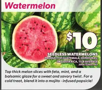 This promotion is available in various stores, view all products to get the cheapest SEEDLESS WATERMELONS. If you'd like to find out whether this product has a bigger discount in another store, check the category 'Grocery'. You may also find these offers interesting: CANTALOUPE OR MINI SEEDLESS WATERMELONS, SEEDLESS MINI CUCUMBERS & RED SEEDLESS GRAPE.