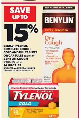 SMALL-TYLENOL COMPLETE COUGH, COLD AND FLU TABLETS OR CAPSULES 18/20'S BENYLIN COUGH SYRUPS 100 ML promotion at Loblaws