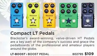 Long & McQuade offers a wide collection of products, besides the BLACKSTAR COMPACT LT PEDALS. Keep an eye on the weekly Long & McQuade flyer to find the best offers and promotions. Besides BLACKSTAR COMPACT LT PEDALS, you can also find the following offers: BLACKSTAR COMPACT LT PEDALS LT-DIST I DISTORTION PEDAL, BLACKSTAR AMPLIFICATION COMPACT LT-DRIVE PEDALS & BLACKSTAR FLY 3W COMPACT MINI GUITAR AMP.