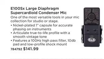 This promotion is available in various stores, view all products to get the cheapest CAD AUDIO E100SX LARGE DIAPHRAGM SUPERCARDIOID CONDENSER MIC. If you'd like to find out whether this product has a bigger discount in another store, check the category 'Electronics'. You may also find these offers interesting: MOJAVE LARGE-DIAPHRAGM CONDENSER MIC - MA-200, UNIVERSAL AUDIO BOCK251 LARGE-DIAPHRAGM TUBE CONDENSER MICROPHONE & GAP E70 MODULAR DUAL-CAPSULE CONDENSER MIC.