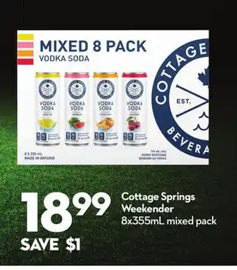 This promotion is available in various stores, view all products to get the cheapest Cottage Springs Weekender. If you'd like to find out whether this product has a bigger discount in another store, check the category 'Grocery'. You may also find these offers interesting: Cottage Springs Punched Up Vodka Soda Mixed, COTTAGE FARMS & Selection cottage cheese.
