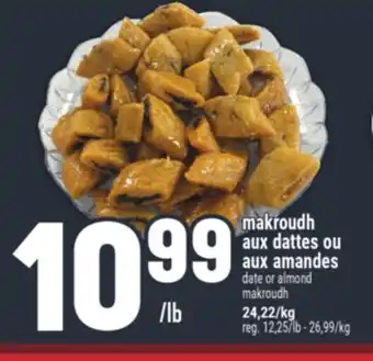 The price of MAKROUDH AUX DATTES OU AUX AMANDES | date or almond makroudh can be found at the top of the page, together with the dates during which the offer is available. You can also check the price in the current Marché Adonis flyer or on the Marché Adonis website. Promotional offers assure you of buying Marché Adonis products at the lowest price.