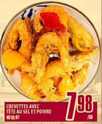 This CREVETTES AVEC TÊTE AU SEL ET POIVRE is now on sale at Marché Lian Tai. Check the current selection filled with great deals and discounts. Purchase CREVETTES AVEC TÊTE AU SEL ET POIVRE online via Marché Lian Tai website or get it at the best available price in person. Flyerdeals.ca gathers the best CREVETTES AVEC TÊTE AU SEL ET POIVRE promotions for you. Click on the bell icon to receive a free notification when this product is on sale again.CREVETTES AVEC TÊTE AU SEL ET POIVRE promotions for next week