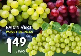 This RAISIN VERT is now on sale at Marche Salaberry. Check the current selection filled with great deals and discounts. Purchase RAISIN VERT online via Marche Salaberry website or get it at the best available price in person. Flyerdeals.ca gathers the best RAISIN VERT promotions for you. Click on the bell icon to receive a free notification when this product is on sale again.RAISIN VERT promotions for next week