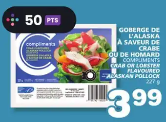 This promotion is available in various stores, view all products to get the cheapest COMPLIMENTS CRAB OR LOBSTER FLAVOURED ALASKAN POLLOCK. If you'd like to find out whether this product has a bigger discount in another store, check the category 'Grocery'. You may also find these offers interesting: COMPLIMENTS Crab or Lobster Flavoured Alaskan Pollock, COMPLIMENTS CRAB OR LOBSTER FLAVOURED FLAVOURED ALASKAN POLLOCK & SEAQUEST CRAB OR LOBSTER FLAVOURED POLLOCK FLAKES OR CHUNKS, 227 G.